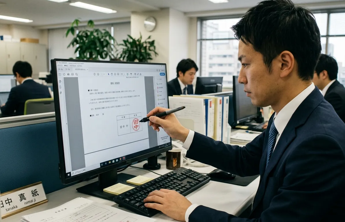 昨年12月の初旬、在宅ワークが始まって1週間目。上司から稟議書に判子を押して送り返す依頼。判子は会社のデスクに。